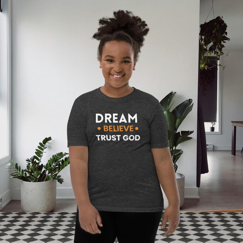 Encourage young hearts to walk confidently in faith with this Dream Believe Trust God Christian youth t-shirt. A powerful reminder that with God, dreams are possible and faith leads the way.